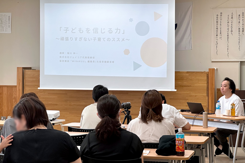 と題し、長年の保育園経営と保育雑誌『MiRAKUU』編集を通して得た経験から、広く子育てについてお話いたしました。